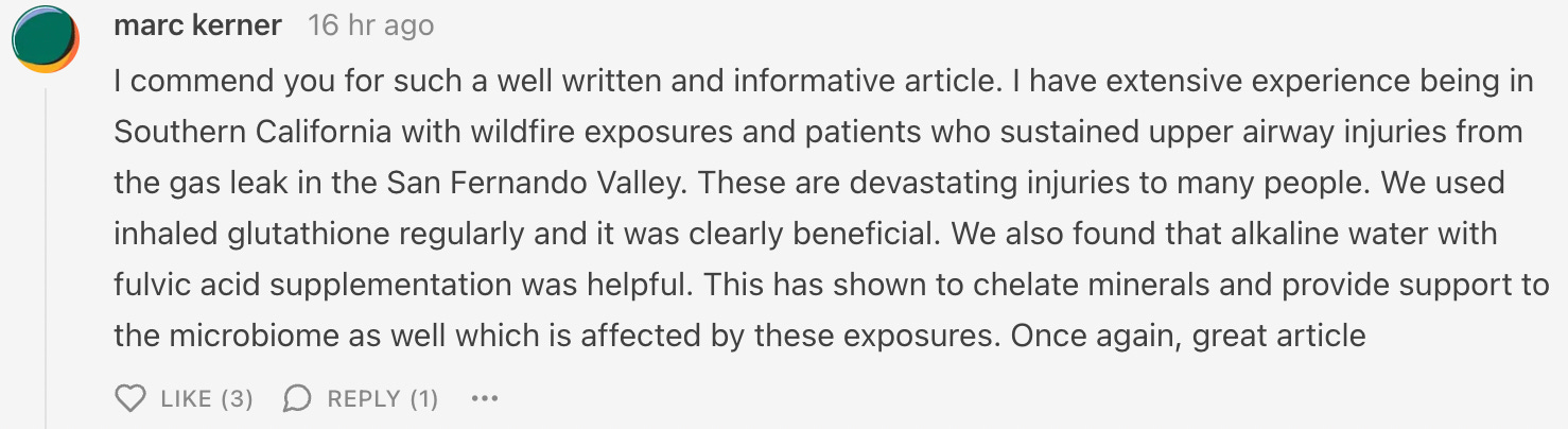 Note: another colleague in the Midwest has also found glutathione works for wildfire illnesses, but due to his location, like me, he does not see anywhere near as many of these patients. Since we have less experience with the wildfire issue, I would like to share this comment on an earlier article about wildfire toxicity from a California doctor (I verified) who utilized nebulized glutathione: