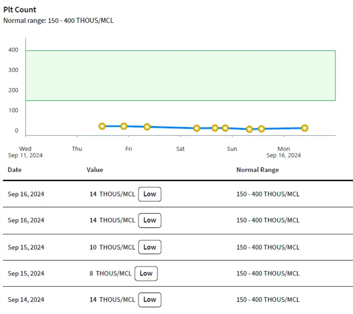 Note: in her medical records, there are also numerous correspondences indicating that a nurse reported this critical platelet lab value to the doctor.