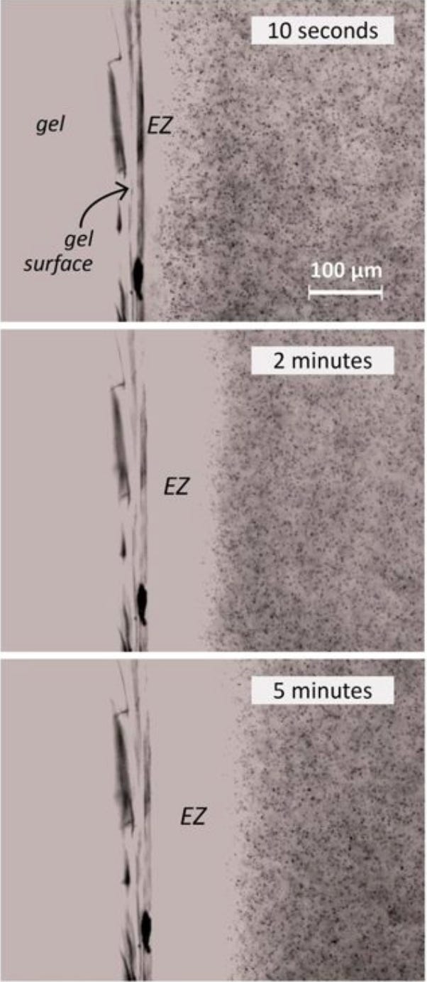 This and a variety of other observations led Pollack to conclude that a structured layer of water was forming at the interface of certain substances placed in water. It should be noted the existing conventional scientific viewpoints support the notion that a few water molecules will cluster together in these interfacial zones, but, nothing on 0.1 millimeter scale that Pollack observed (which requires approximately one hundred thousand times as many water molecules to line up).