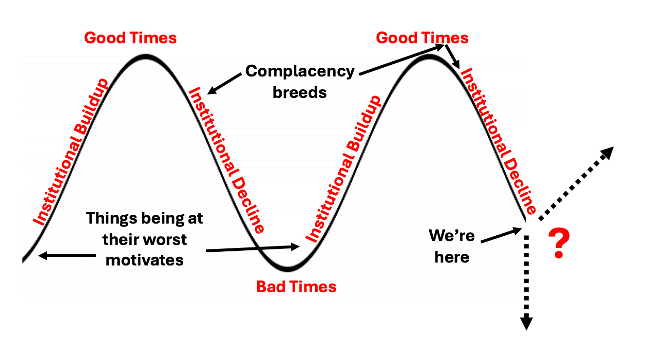 Every society throughout history has followed the same cycle, alternating between periods of institutional buildup and decline