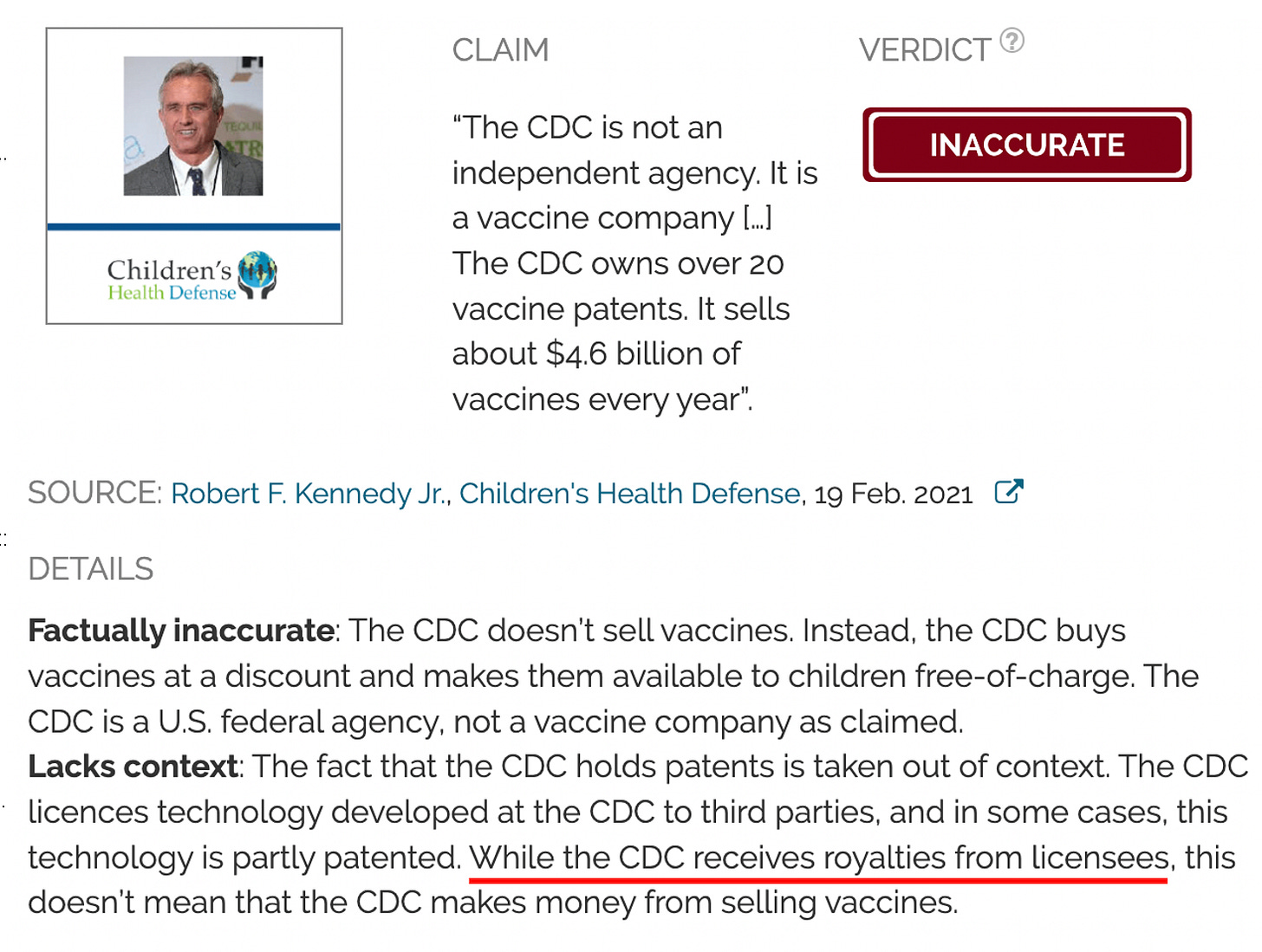 Likewise, many parts of the federal government are financially incentivized to sell vaccinations and other pharmaceuticals as they both own patents on the pharmaceutical products and are paid by their manufacturers for the process of approving them. However, while these conflicts of interest are widespread (an excellent summary of which can be found here), I am less sure exactly how much money is ultimately made, as many tricks are available to hide that money (such as paying off regulators in the private sector after they leave the government). Fact-checkers for example acknowledge these conflicts of interest exist, but like everyone else insist their effects are minimal: