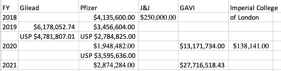 Following publication of this article, I uncovered where the more detailed summaries of the CDC foundation’s outside funding could be found (e.g. FY2018, FY2019, FY2020, FY2021). Although the Gates Foundation was one of their largest donors, there were many other large contributors (note: as many grants ran through multiple fiscal years, they were tabulated for the first year they went into effect).