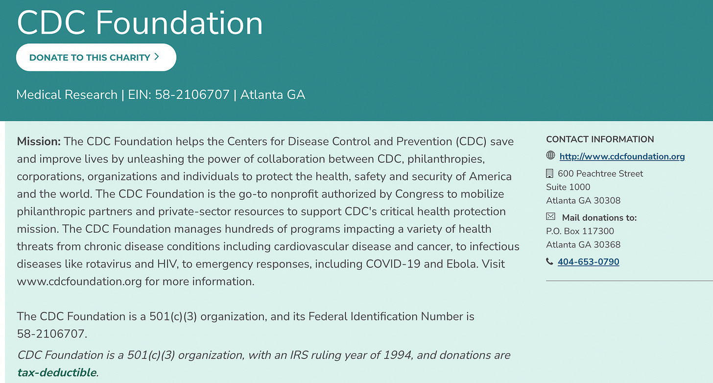 In 1983, Congress authorized the CDC to accept gifts “made unconditionally…for the benefit of the [Public Health] Service or for the carrying out of any of its functions.” In 1992, Congress established The National Foundation for the Centers for Disease Control & Prevention so that CDC could obtain additional funding for its work, or put differently create a third party to pass money along to the CDC. Two years later, it was incorporated to “mobilize philanthropic and private-sector resources.”
