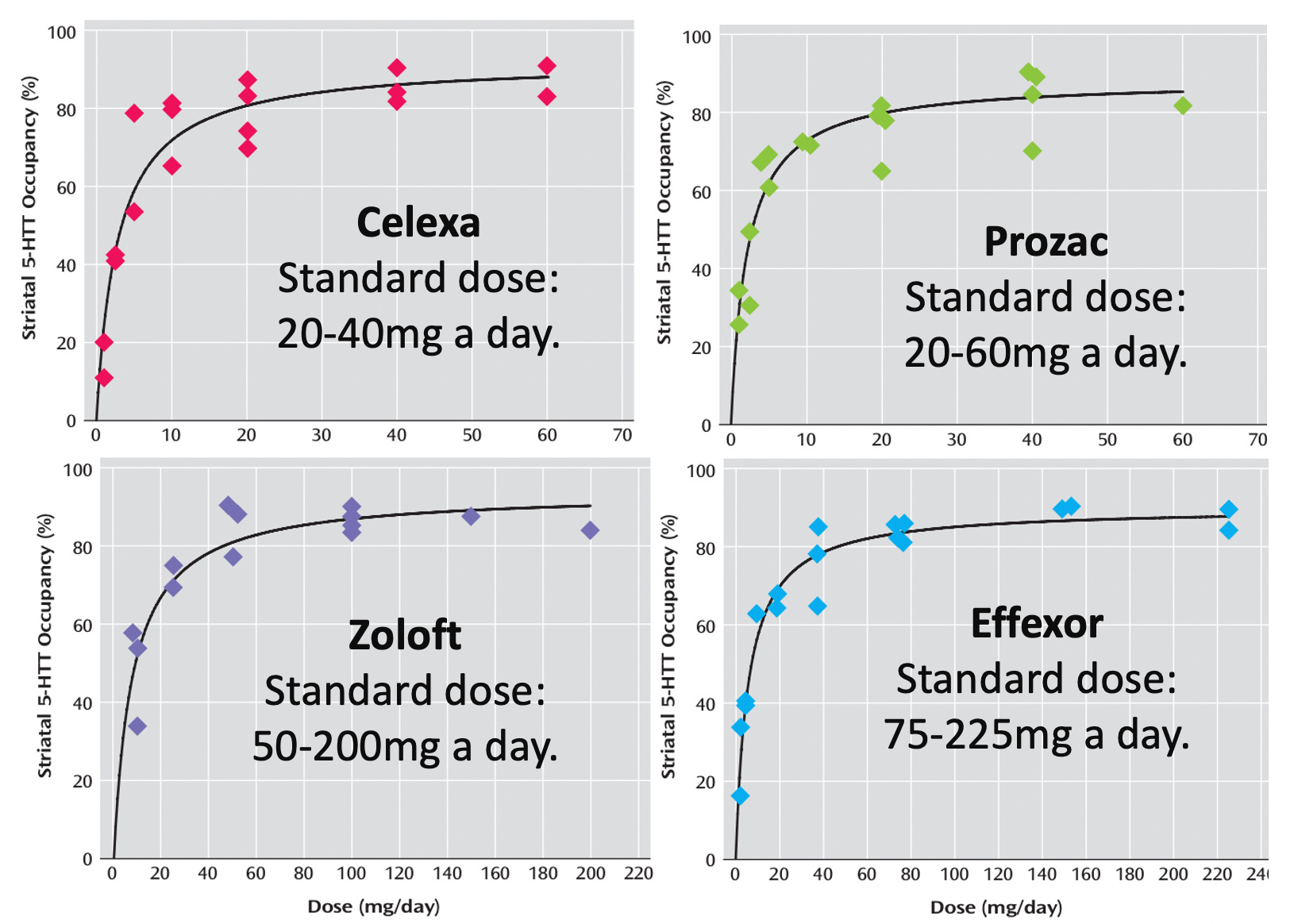 For the roughly 50% of people who experience SSRI withdrawals, one of the most challenging things is how incredibly slowly they have to stop taking them. A major reason for this is due to the non-linear relationship between an SSRI dose and its binding to the brain (e.g., its striatum).
