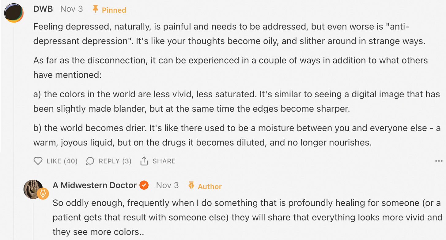 In time, I began to hear stories of people describing how their experience of life was deadened, often in a manner not too different from how the drugs “numb” your sexuality. Some of the common stories included: