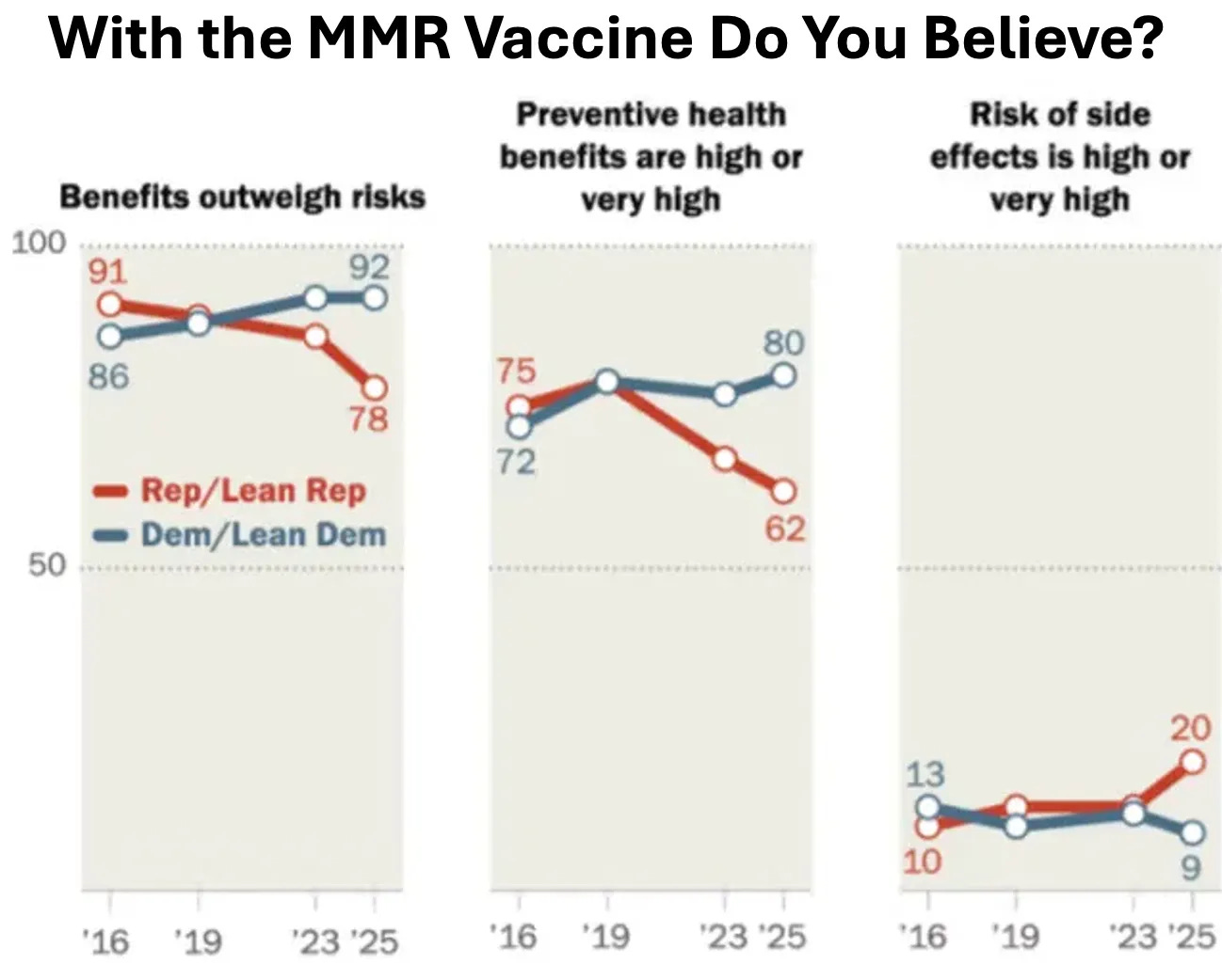 A parallel Pew poll found only 57% had high confidence in childhood vaccine effectiveness (45% R vs. 71% D), 44% were confident in their safety testing (29% R vs. 63% D), and only 41% fully trusted the CDC vaccine schedule (27% R vs. 58% D).20 Similar results were found by a KFF tracking poll: