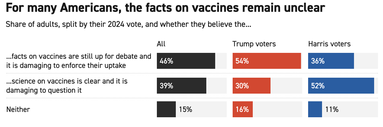 •First, the media and lobbyists have widely circulated a biased poll claiming eight times as many voters strongly support vaccines as question them (effectively making it a "90-10" issue) and that voters are overwhelmingly opposed to changing the vaccine schedule. This in turn was used to convince the Trump administration to make Trump and RFK back off from discussing vaccines until after the midterms—even though the coalition which elected him in 2024 supported safety reforms on vaccines and every other poll which has been conducted shows there is widespread support for vaccine safety reforms.