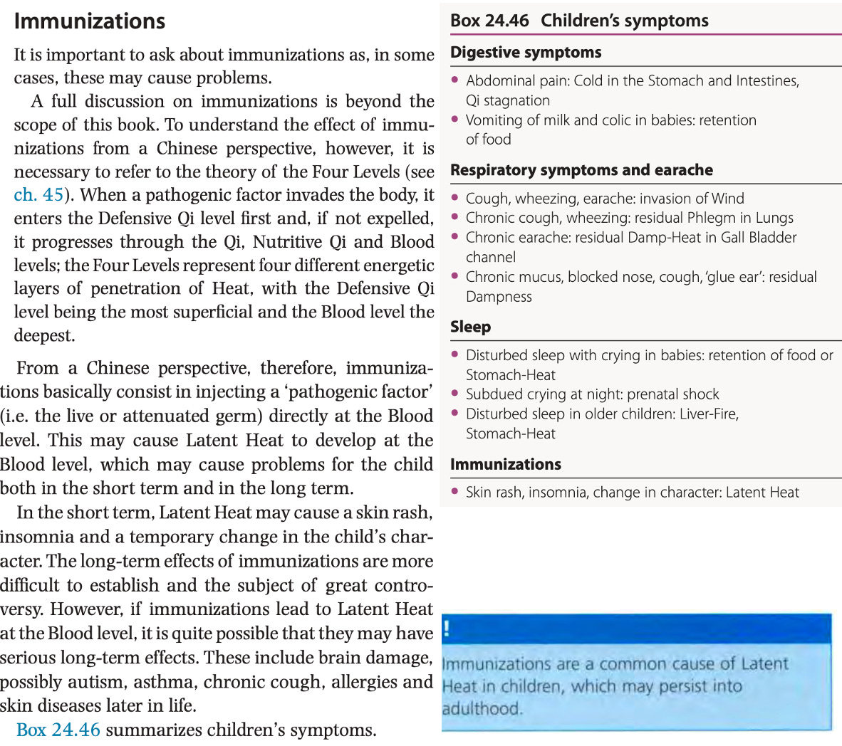 Many holistic systems including Chinese medicine and homeopathy argue that vaccinating through intramuscular injections is unwise because it allows a pathogenic factor to penetrate deep inside the body. This concern exists both for the reasons outlined in the previous section, and because the natural route of exposure the body relies upon to build immunity is bypassed when vaccines are directly injected. For example, this is how a foundational Chinese medicine textbook discusses this topic: