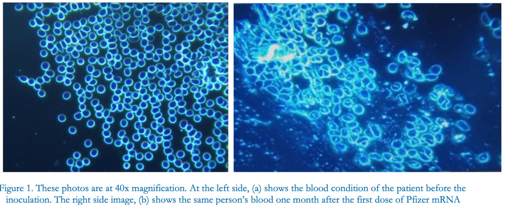 Out of 1,006 patients analyzed, researchers found only 58 had a normal blood profile. In other words, 95% of the thousand patients had abnormal blood following the injections. The researchers had access to pre-injection blood samples so were able to accurately compare the patients’ blood before/after.