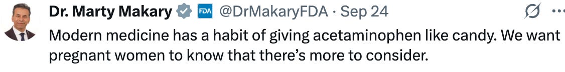 As I heard this announcement, like many, I felt this was remarkable progress on a previously unsolvable issue. I was also grateful Trump drew mainstream attention to the concept it was not necessarily a good idea to “treat” an uncomfortable fever, and noted that his repeated statement that pregnant mothers should do their best to “tough it out” rather than take Tylenol was very similar to conversations I’d had throughout COVID with non-pregnant patients.