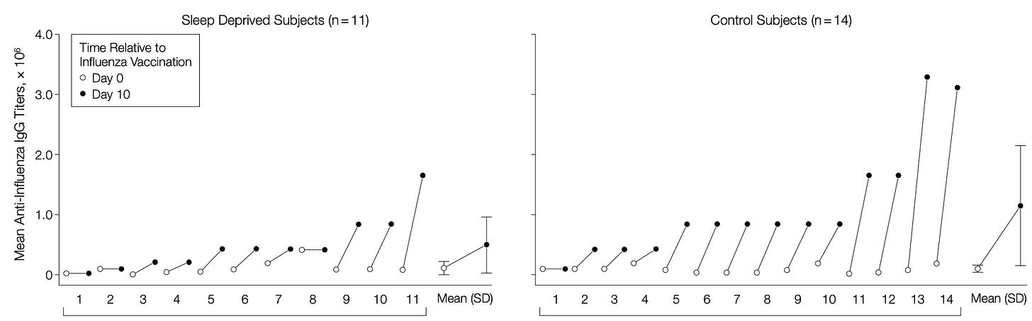 •A 2002 study compared 14 healthy young men who slept for 7.5-8.5 hours a day to 11 others who restricted their sleep to 4 hours a night for 6 days, after which all 25 received a flu shot. The sleep-deprived group was observed to produce less than half the vaccine antibodies seen in the control group, and this loss continued after normal sleep had been restored