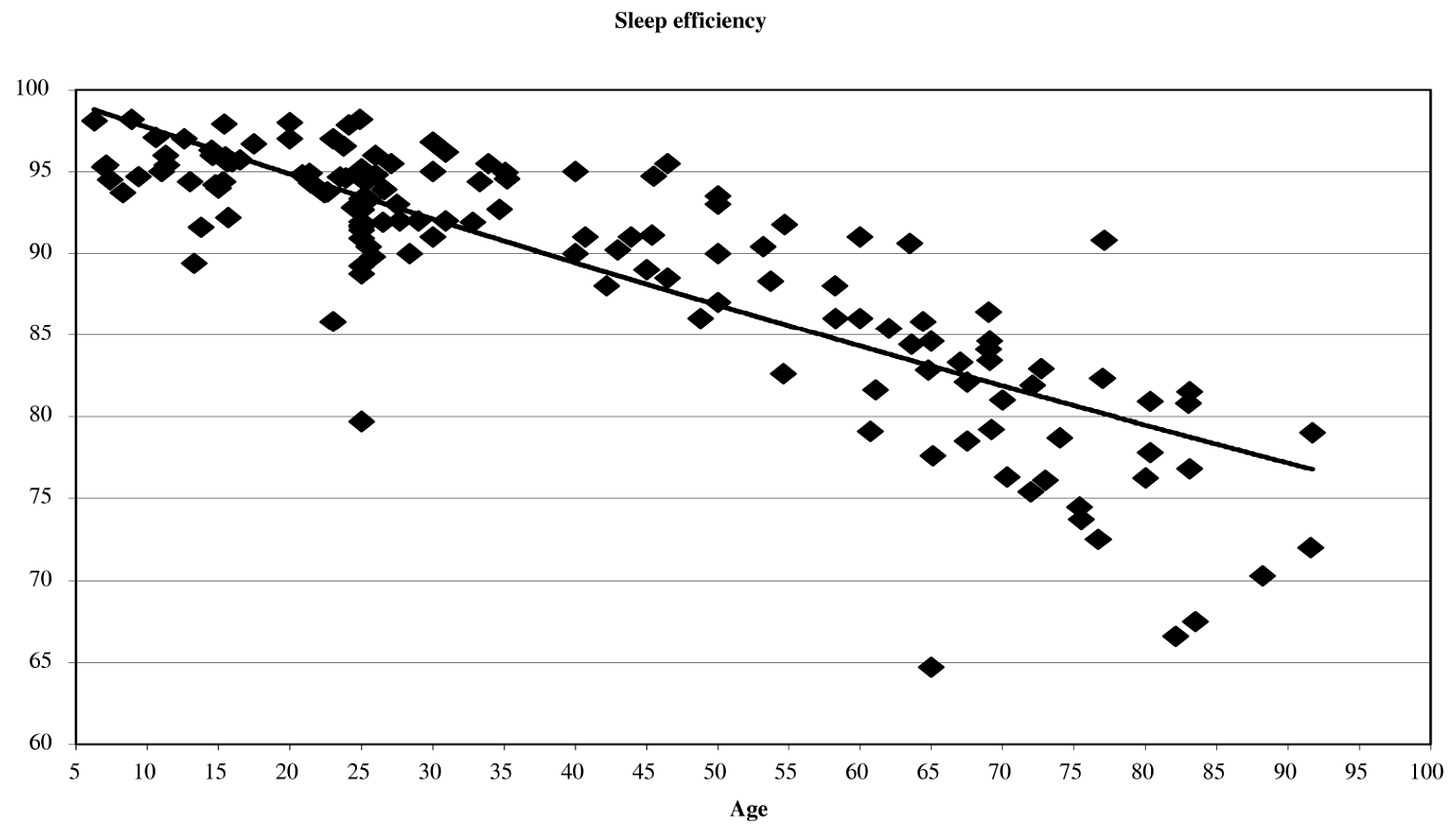 3. Sleep is an active energy intensive process. Because of this, if the drive for sleep is weak and significant barriers to sleep exist (e.g., age related damage to the parts of the brain which initiate sleep), it’s often not possible (or quite difficult) to get to sleep, which in turn creates a downhill spiral (because deficient sleep further worsens the brains ability to maintain its health).