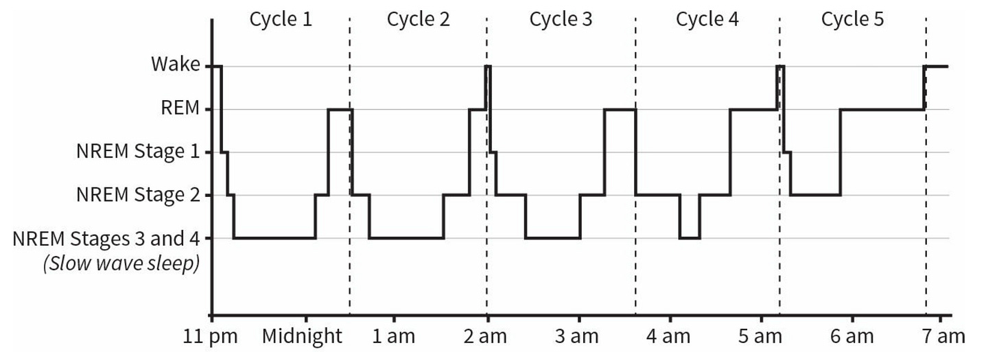During sleep, the body cycles through different phases of sleep, each of which performs a critical function (e.g., deep NREM sleep heals the brain and allows toxins to drain out of it through the glymphatics, while REM sleep consolidates memories and allows one to process the emotions of their experiences). A typical sleep cycle goes as follows: