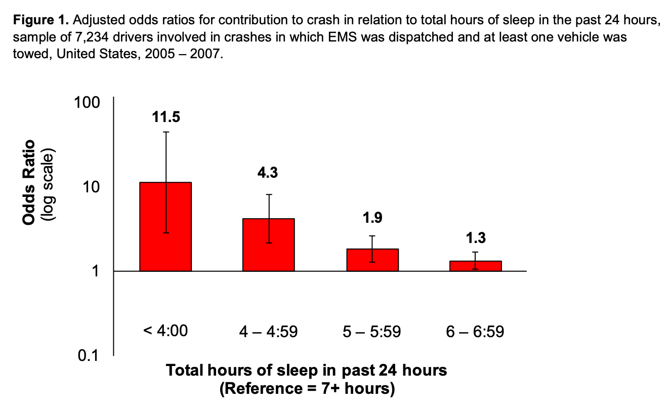 Note: for comparison, those with a blood alcohol content of 0.08 are 4X more likely to crash, whereas those with a BAC of 0.15 are at least 12X more likely to crash.