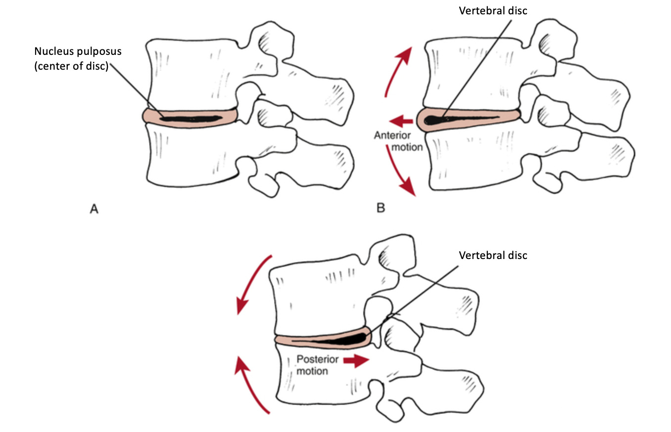 When you bend backwards, the disc is pushed forwards, while when you bend forwards, the disc is pushed backwards and can compress the nerves behind it.