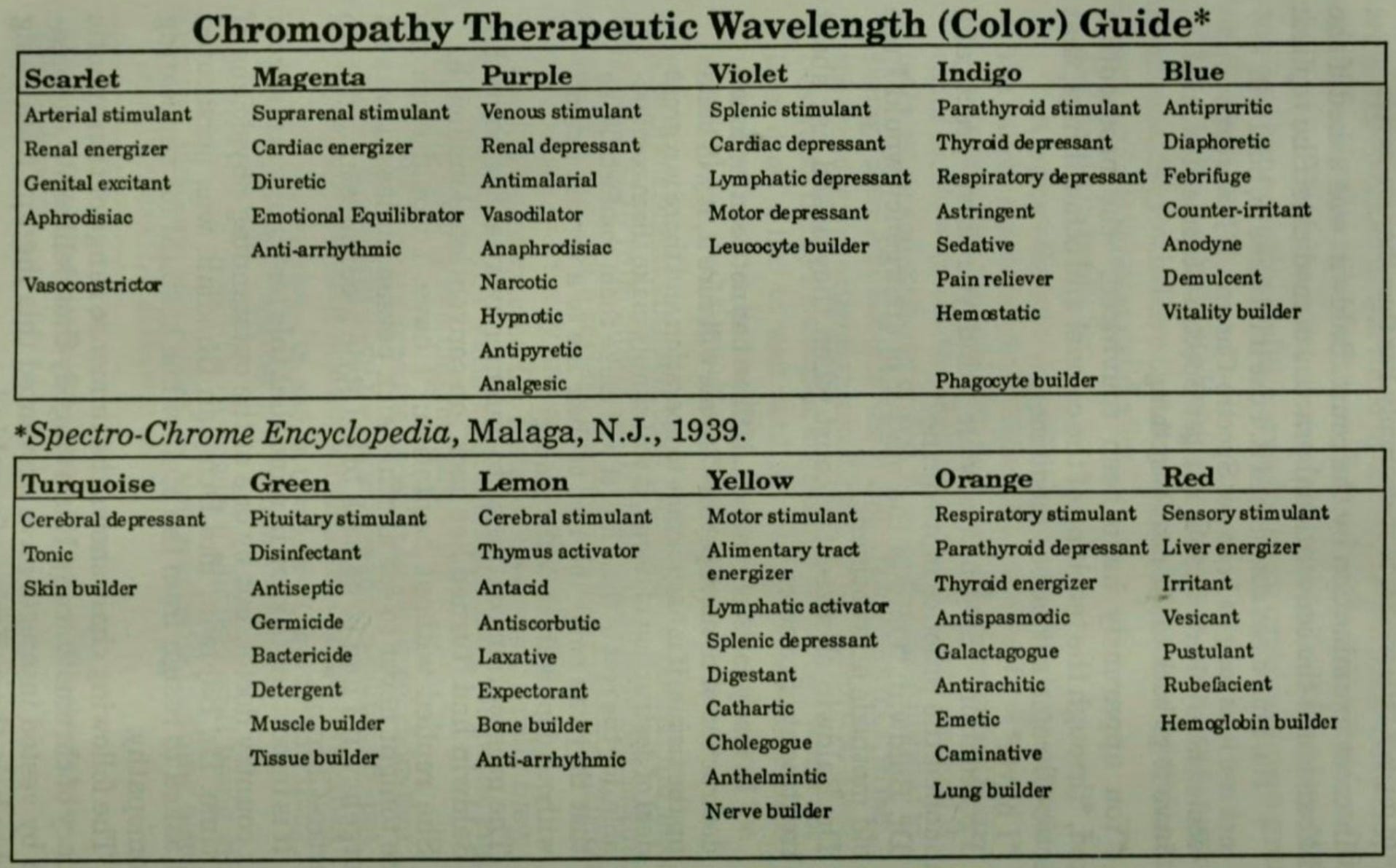 Fourth, Ott believed that different parts of the body were highly sensitive to minute amounts of light (or EMR) at very specific frequencies. Likewise, he also suspected the effects of many drugs and pathogens were mediated by which specific frequencies of light they absorbed or reflected, a conclusion many others have also arrived at (e.g., a wide range of photosensitizing drugs exist and many believe red food dyes cause hyperactivity because they create red light within the body). It’s worth noting that a longstanding practice of medicine which utilized a variety of colors previously existed in the United States (which a few of my color-inclined colleagues still utilize with great success). This for example was from a 1939 reference about the therapy:
