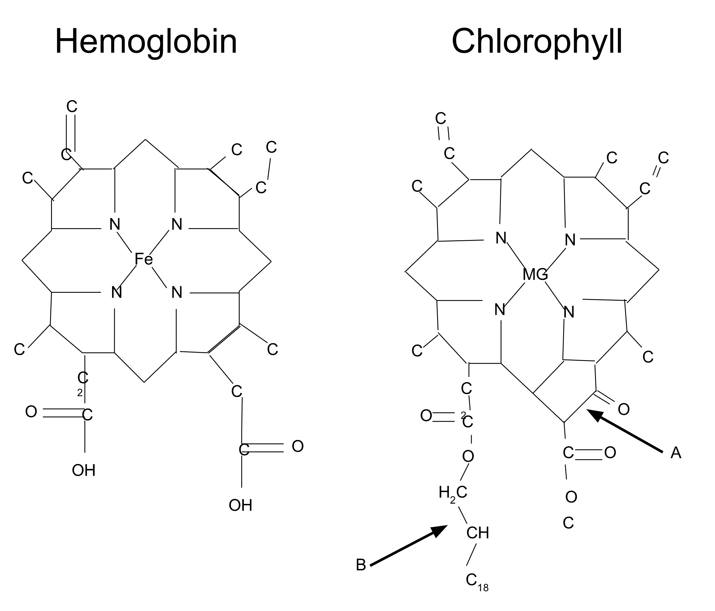 2. Many living proteins function by transferring electrons from one place to another to facilitate the basic processes of life (for example, the electron transport chain is what mitochondria use to produce the energy which sustains the body). A class of circular biological models known as the porphyrins excel at this function (e.g., they are part of the mitochondrial electron transport chain), and as Arthur Fristenberg makes an extensive case for in chapter 10 of his book about the biological toxicity of EMFs, porphyrins effectively function as semiconductors and are used in the most critically important parts of the body (e.g., throughout the nervous system). Two of the most well known porphyrins are as follows: