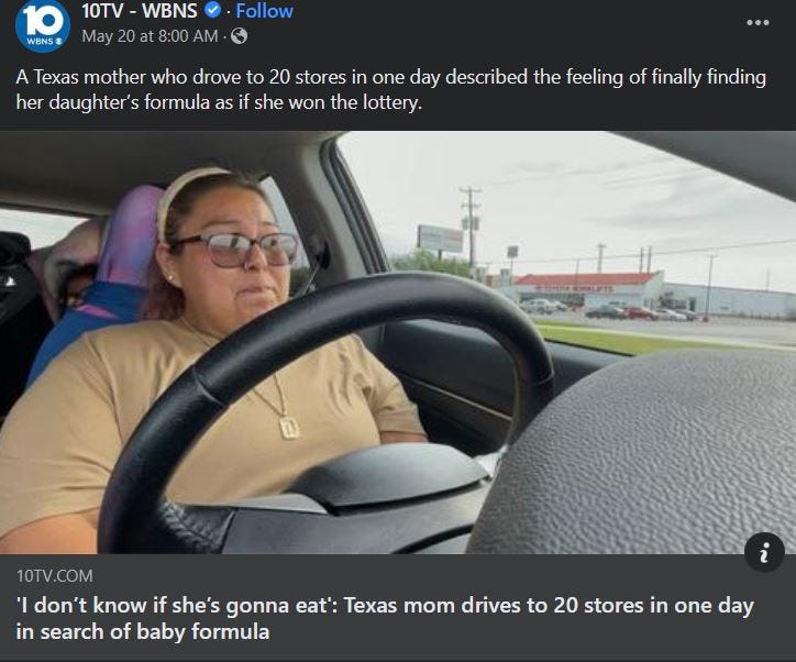 Panic over the lack of formula has begun to settle in, and in some places, fights have broken out over the last bottle of enfamil (this recent video was at a target in MA), events which are both unbelievably sad and make me hope all of this is not a beta test for a larger supply chain collapse.