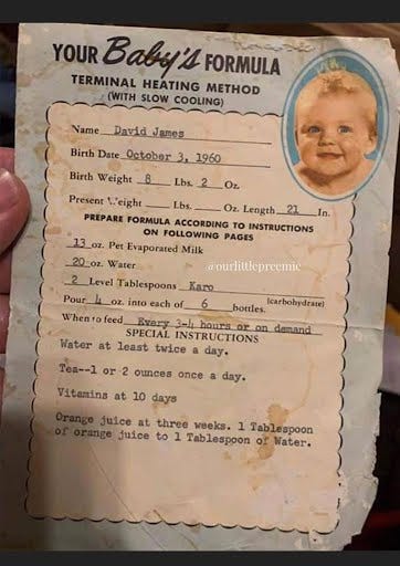 One of my patients belongs to numerous online maternal support groups (including homesteading ones) and has likewise told me that countless mothers are freaking out over the formula shortage and it has not occurred to almost any of them to just breast feed or use goat’s milk (which currently is not in short supply). To address this issue, these communities have been circulating ancient DIY recipes they dug up such as this one for recreating these corn starch slurries at home (Karo is Corn Syrup).